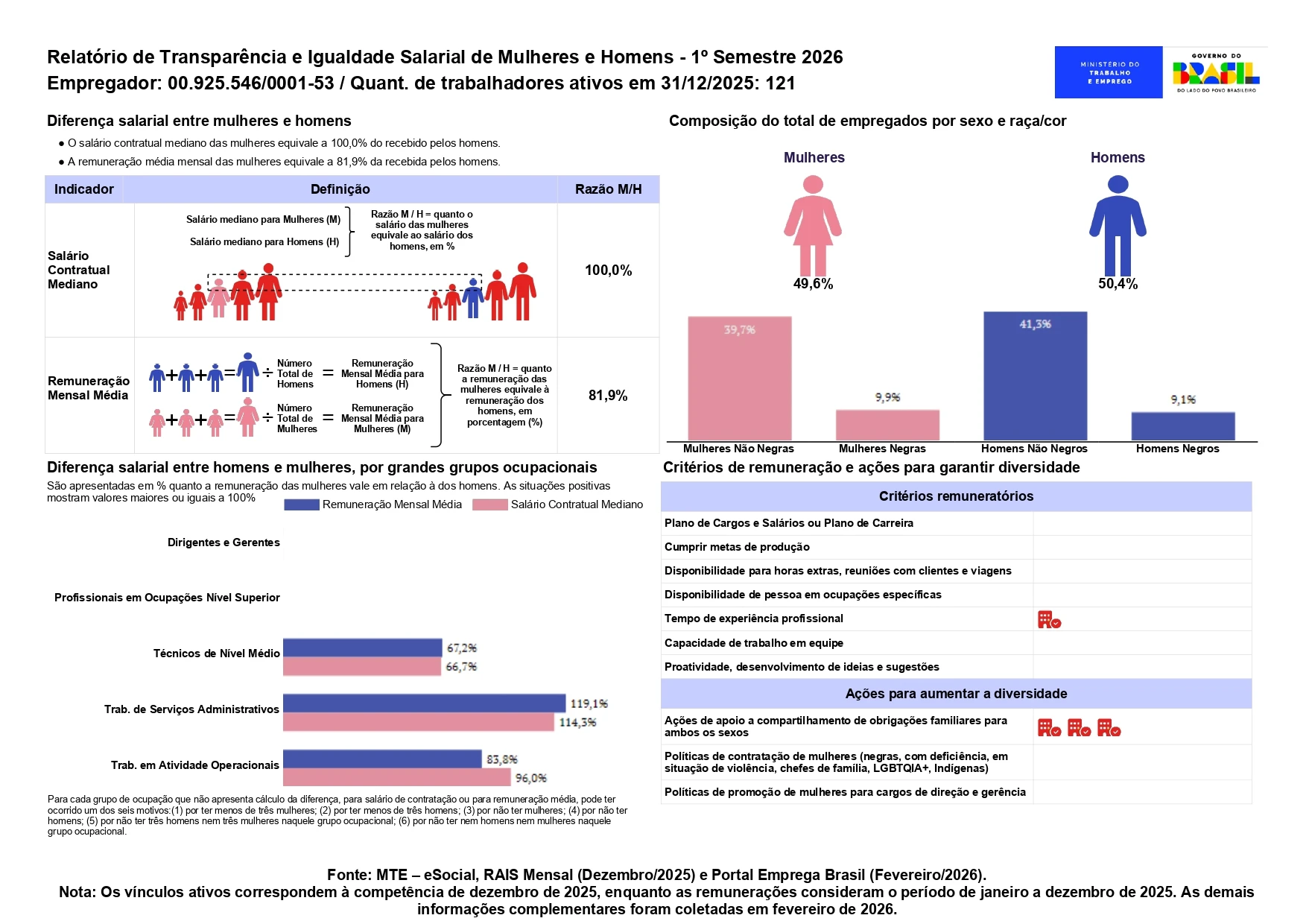O relatório de igualdade salarial apresenta dados relevantes sobre a composição do quadro de colaboradores, além de indicadores comparativos entre remuneração de homens e mulheres.